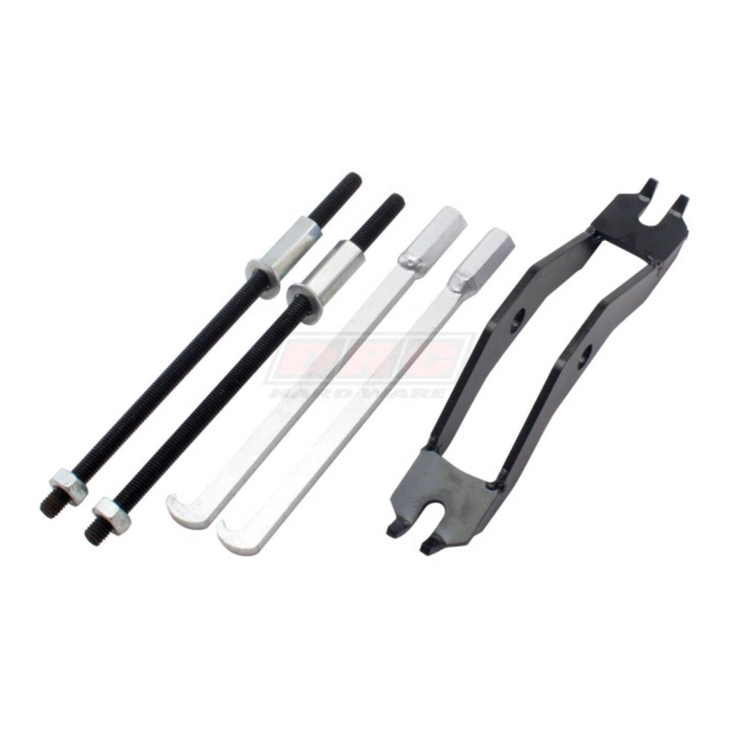 - Spring removal tool for twin shock motorbikes.- 2 spring hooks hold the springs secure while compressing the springs, making it easy to remove the springs from the shock bodies.