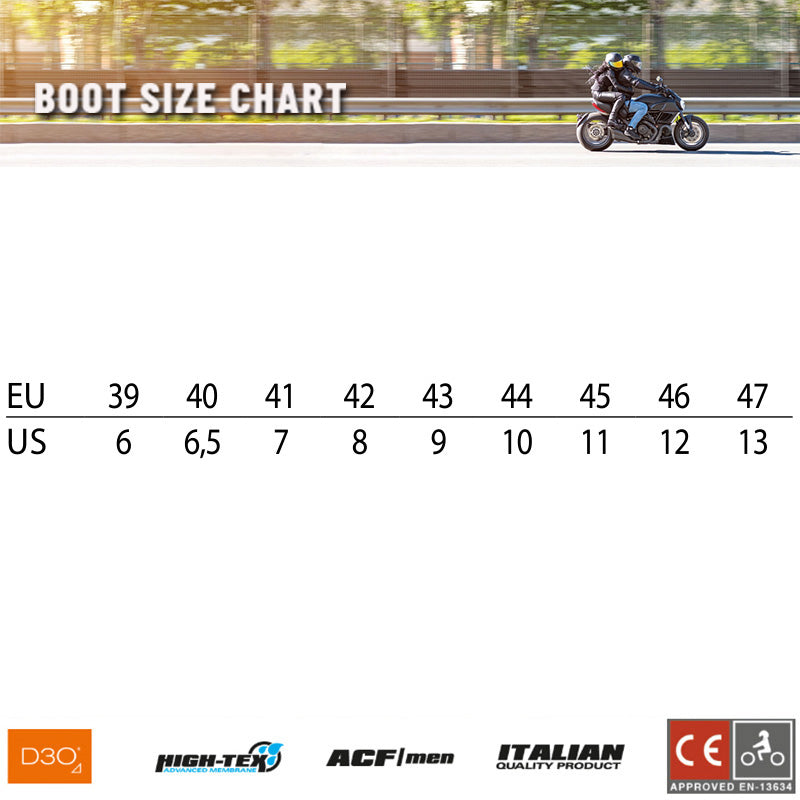 A heritage-classic leather motorcycle boot, with modern waterproofing and urban street styling. The High-Tex Advanced Membrane is resistant to water penetration and is certified waterproof. The D3O® Impact Protection, developed in snow sports and the military industry, was first applied to motorcycle boots by Falco. "D3O Intelligent Molcules" flow freely when moving slowly but on shock, lock together to absorb impact energy. Transmitted force to ankle-foot area is significantly reduced thanks to D3O® exclusive support.