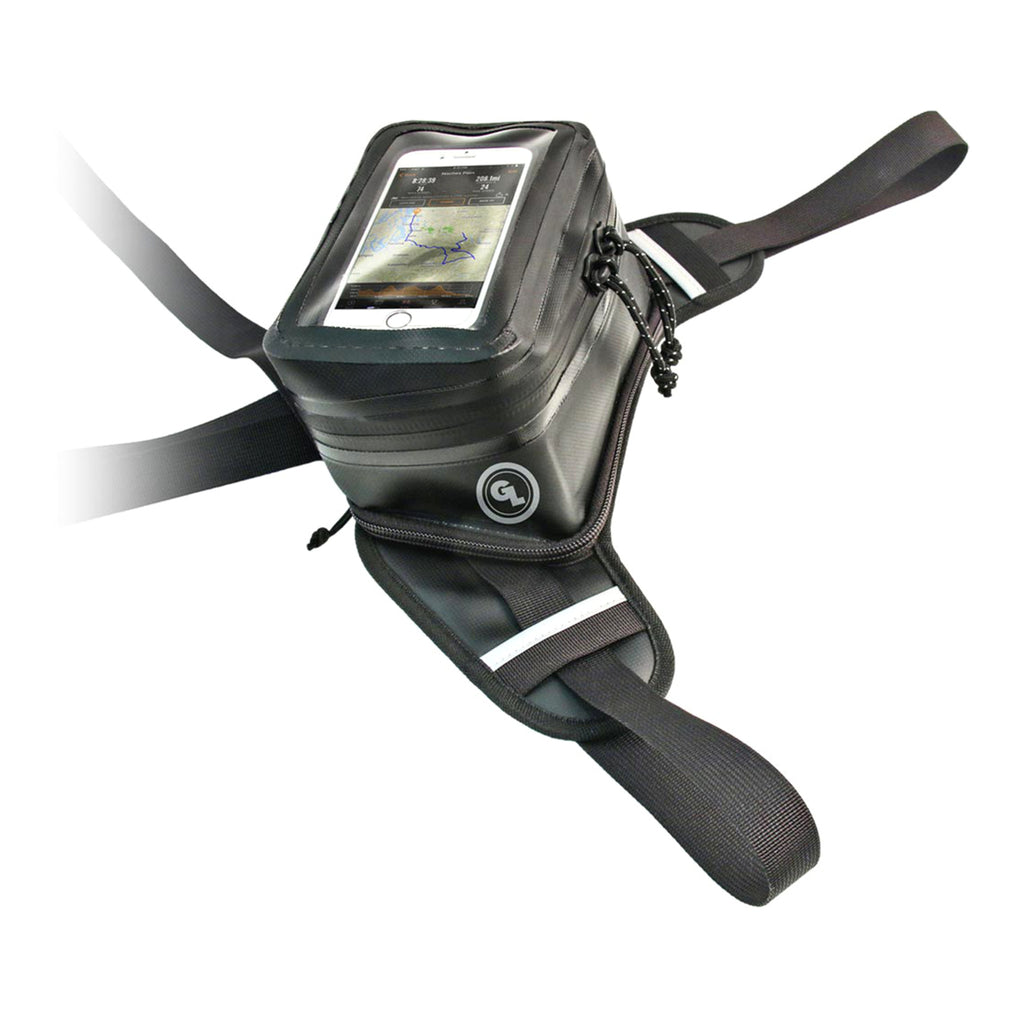 Other key features include rugged Bomb Shell™ coated fabric construction with RF-welded seams, a key clip, internal elastic to keep items organized and secure, a clear vinyl smartphone/map pocket, and an electronics pass-through for on-bike charging and power access (we recommend the BikeMaster USB charger). The clear smartphone/map lid pocket also allows glances at maps or notifications. Combine the Buckin' Roll with Giant Loop Pannier Pockets and Zigzag Handlebar Bag for even more on-the-trail storage volume.