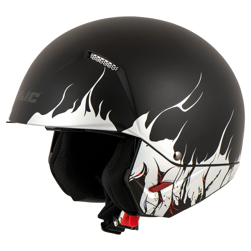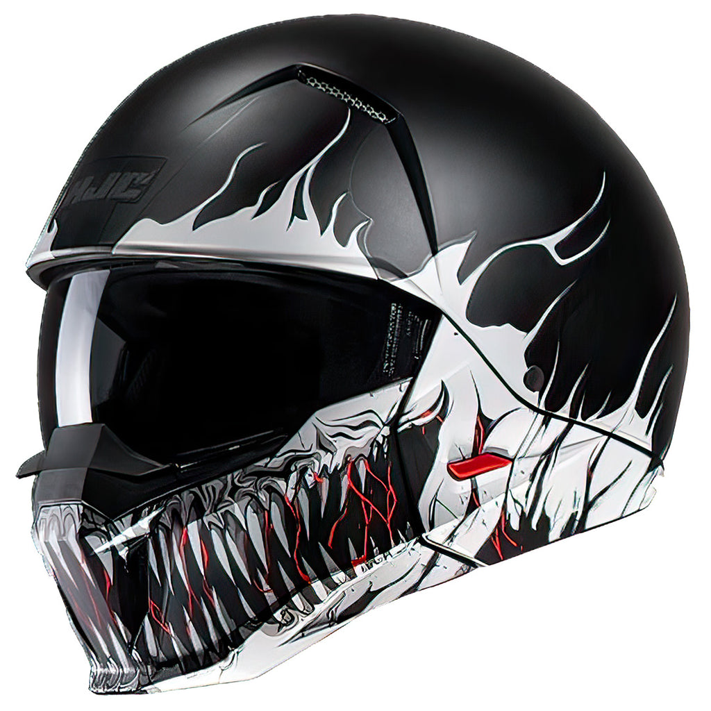 The HJC i20 was developed to offer riders a different approach to the classic open face half helmet. This Street Fighter inspired helmet features a removable mask and an anti-fog coated internal visor (Smoke) that is manually operated with pull tabs on each side of the helmet. Bonus additional clear visor included. The Advanced Polycarbonate Composite Shell is lightweight.