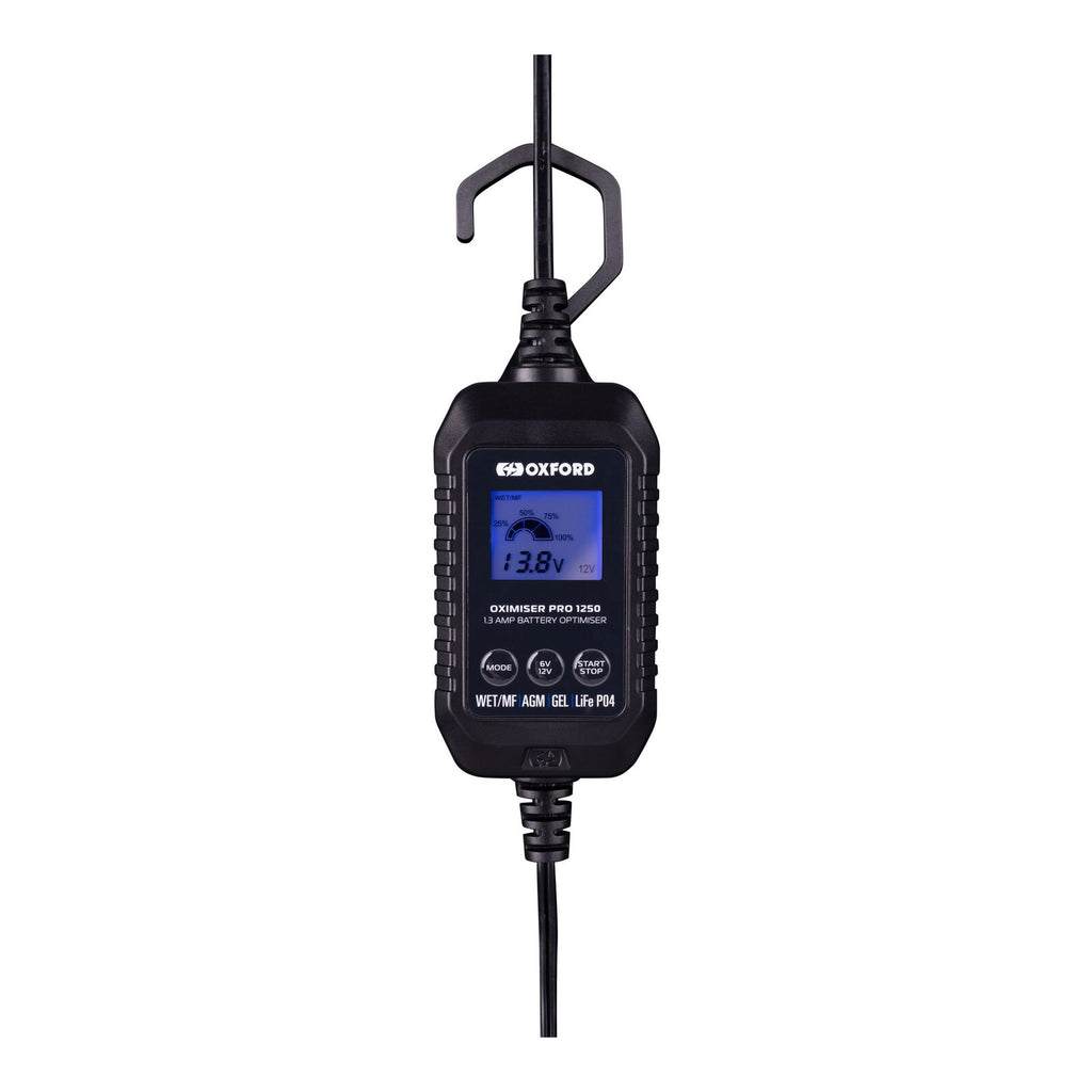Suitable for use in any environment, the Oximiser Pro's high- impact, fire-resistant ABS casing is ultrasonically sealed to achieve an IP65 rating. The clear, easy-to-read LCD display assists the user throughout the charging stages and if required, the charger can be lifted off the ground by clipping on a removable hanger.