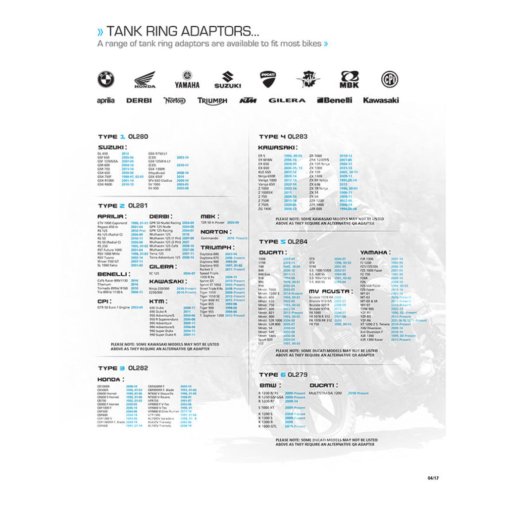 The quick release locking system is super user-friendly due to its one-touch ‘lock-on’ and ‘release’ mechanism. These adaptors allow a Simple, yet ingenious way to convert existing X30 and X20 tank bags to use the new QR system.