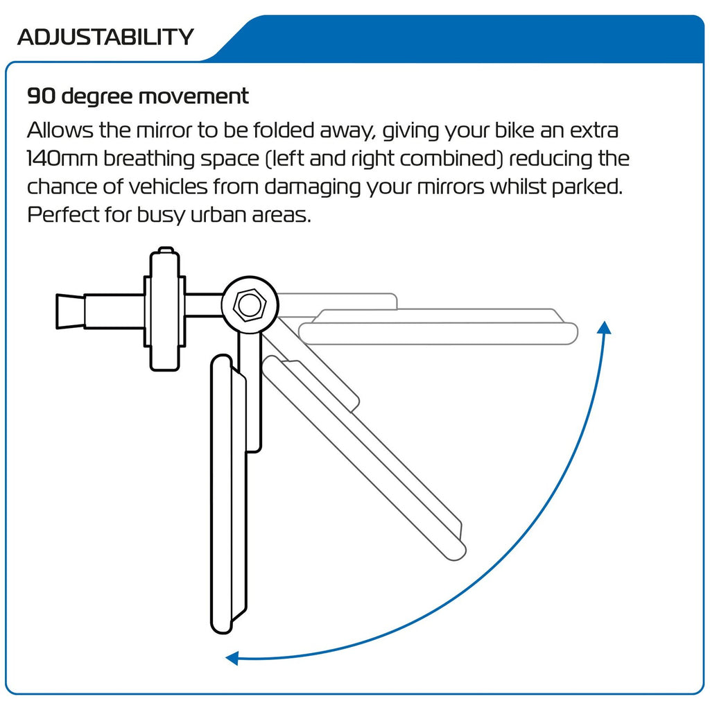 Perfect for busy urban areas, these mirrors can be folded away to give your bike an extra 140mm breathing space (left and right combined). The low-profile design and innovative sprung-bearing hinge mechanism allow the mirrors to be folded in when not needed to take up less space.