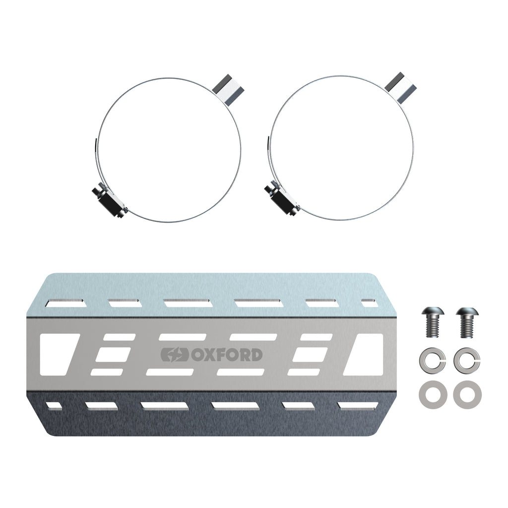 Oxford's Exhaust Heat Shield offers thermal protection by deflecting radiated exhaust heat and guards against you, your clothing or your accessories from accidentally touching a hot exhaust system.