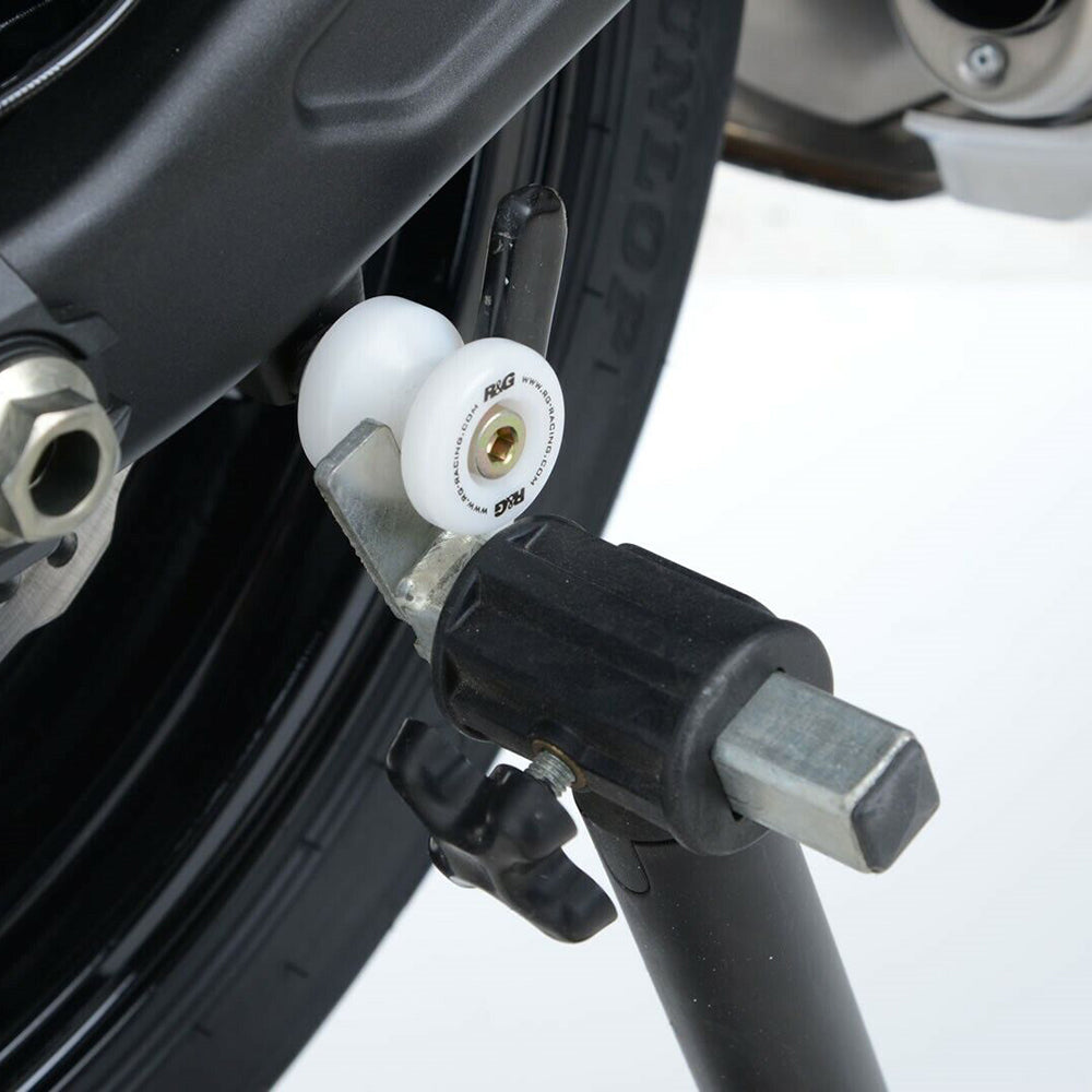 Cotton reels are oversize paddock stand bobbins. Almost a mini version of R&G’s crash protectors the cotton reel is constructed of the same high density polyethylene (HDPE) and held in place with a de-embrittled steel bolt designed to help absorb an impact rather than twist its mounting point. Doubling up as paddock stand bobbins, they allow the motorcycle’s rear wheel to be lifted with the use of a paddock stand, in order to carry out cleaning or chain lubrication, or for storage.