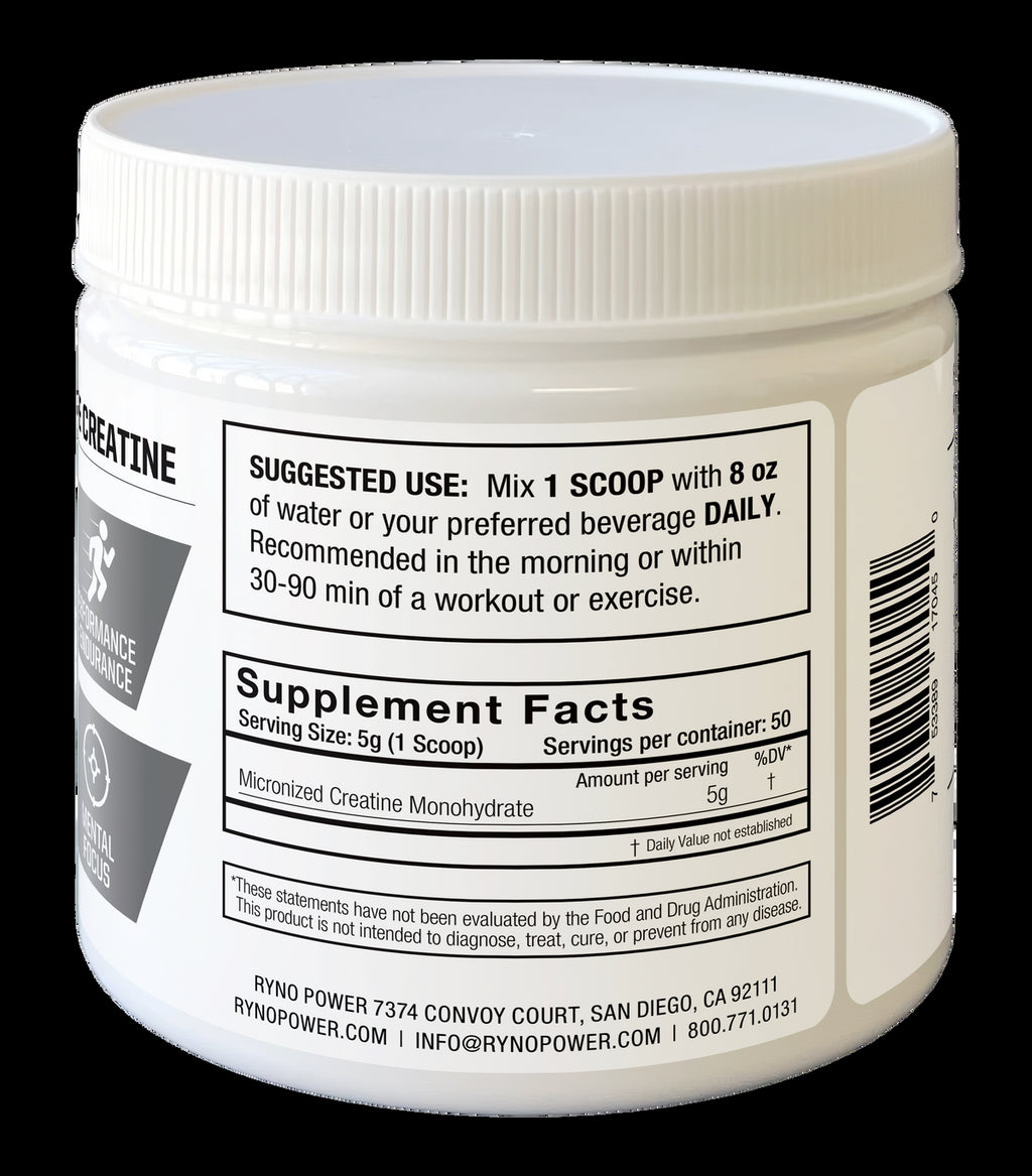 Ryno Power PURE Creatine is the ultimate support for daily muscle performance and cognitive function, using rapidly regenerating ATP for greater strength, endurance, and power. It promotes lean muscle growth and faster recovery while reducing inflammation and oxidative stress. Our PURE Creatine also fuels brain performance, improving focus and mental clarity under stress. With consistent use, it enhances overall energy and helps your body recover stronger every time you train. Feel the difference Ryno Power PURE Creatine will make for you!